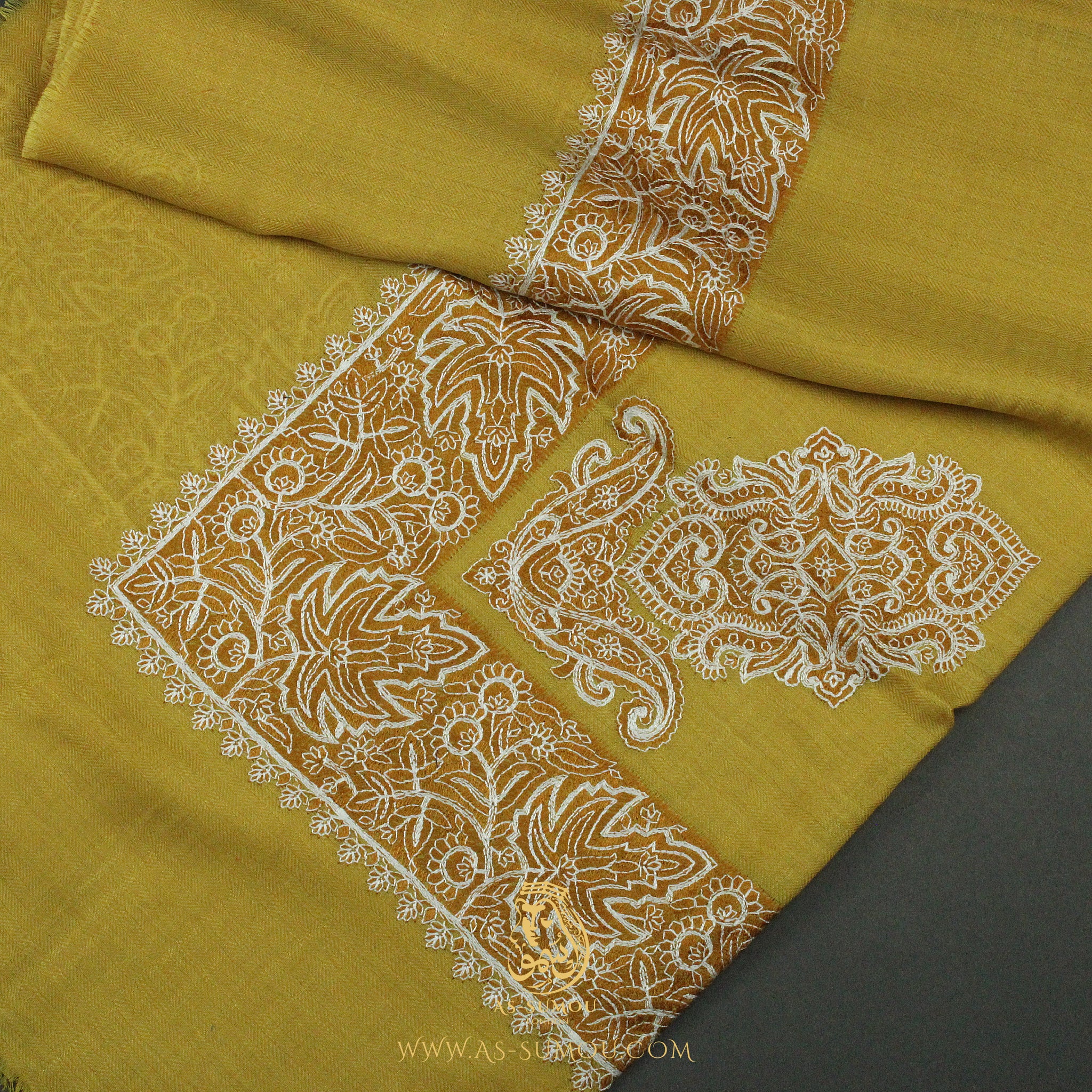 Mustard colour Omani Massar, crafted with meticulous attention to detail. This elegant headscarf is special for its rare combination of two distinct designs woven into the same Massar, making it an uncommon and eye-catching choice for those who appreciate fine Arabian attire.