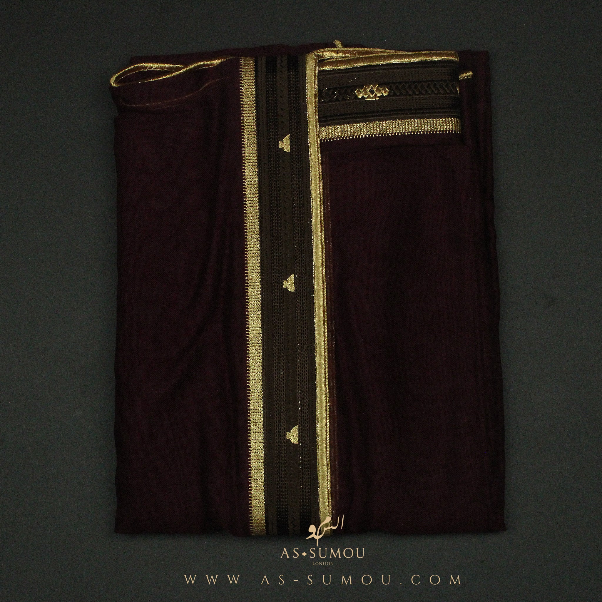 Crafted with meticulous craftsmanship, our maroon Khaleeji Bisht exudes an air of mystery and authority. What truly sets this bisht apart is its unique and intricate embroidery, a rare find that distinguishes it from any other bishts.