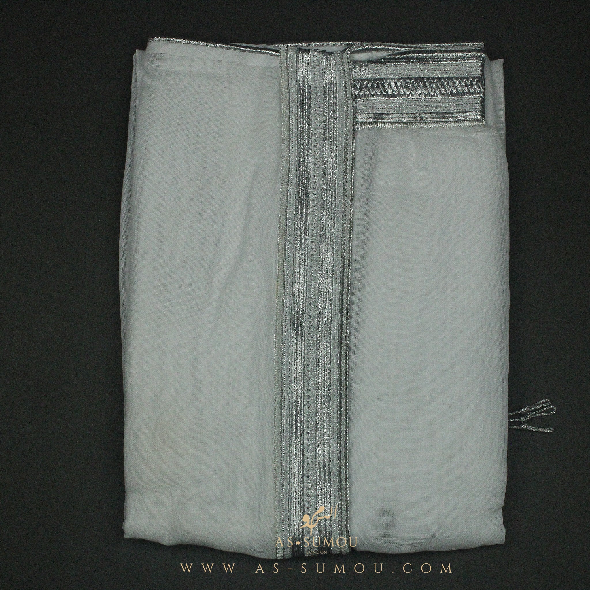 Crafted with meticulous craftsmanship, our white royal Khaleeji Bisht exudes an air of mystery and authority. What truly sets this bisht apart is its unique and intricate embroidery, a rare find that distinguishes it from any other bishts.